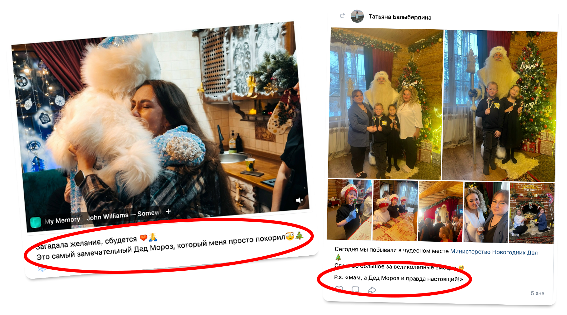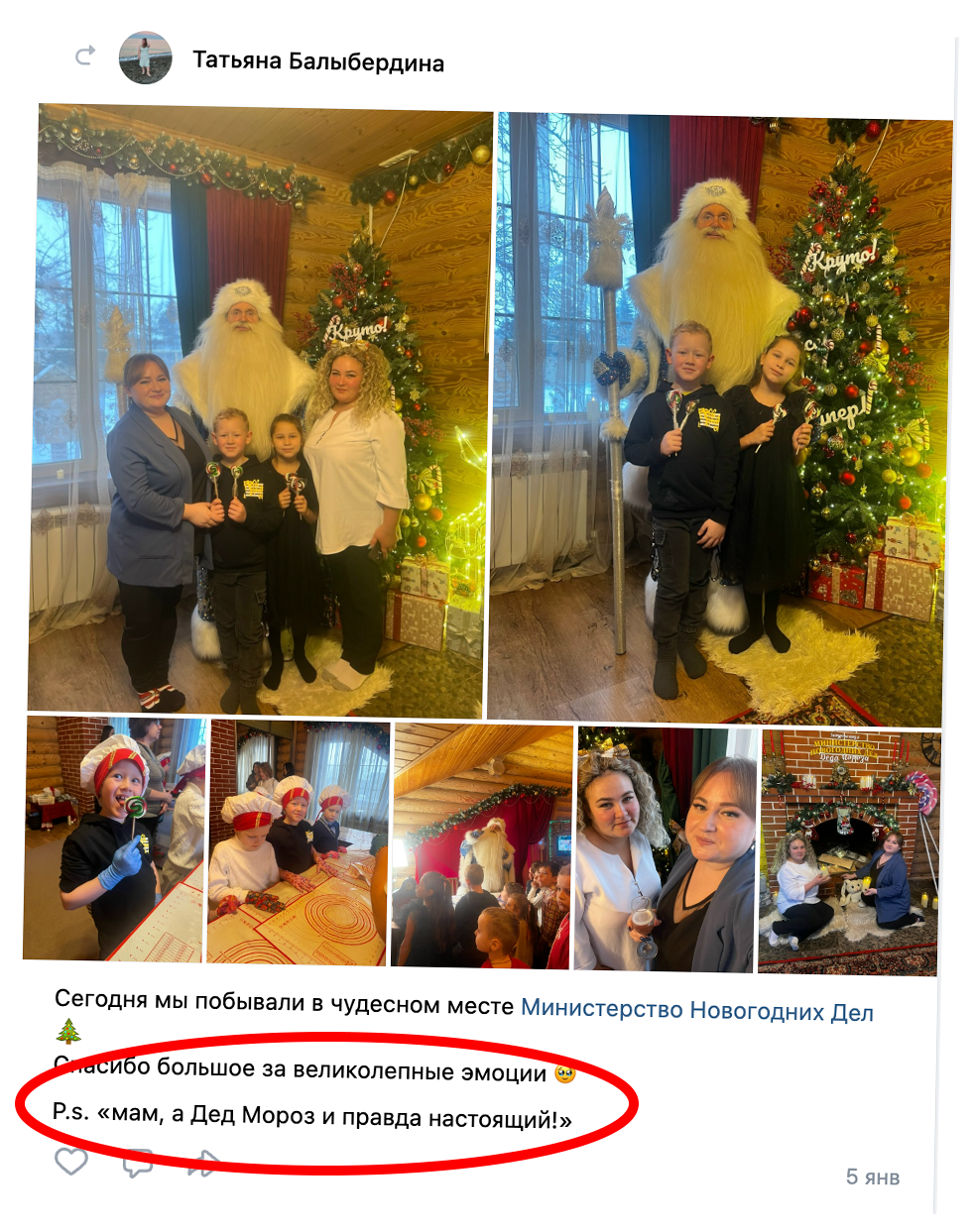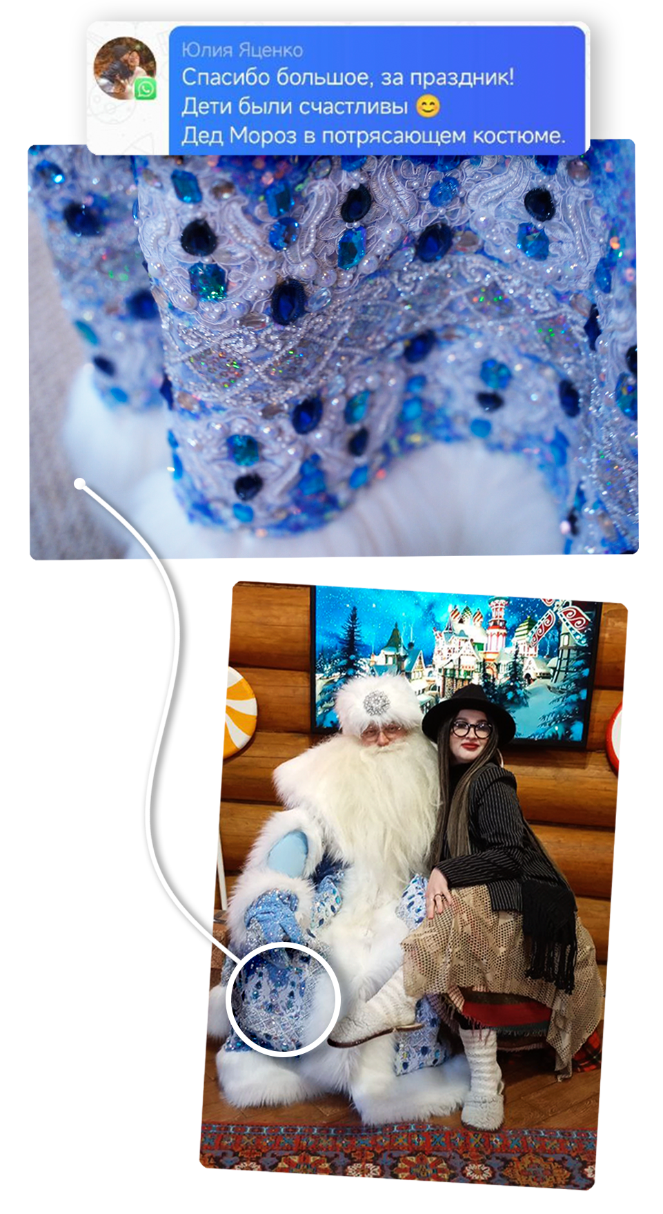Через специальный чат-бот вы отправите фото детей или целого класса прямо на пульт Деда Мороза! Дедушка докажет детям, что знает о них все! Это очень удивительный момент, который мы теперь никогда не уберем из программы!