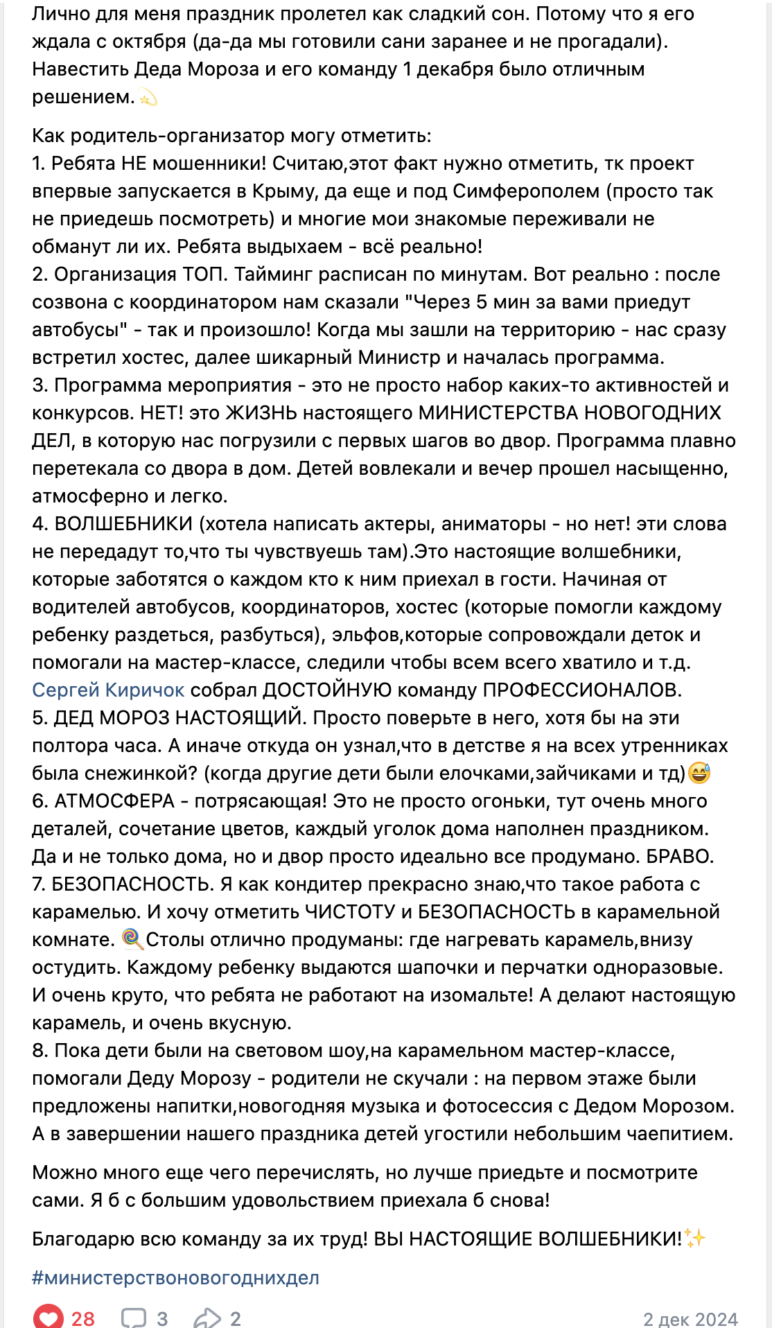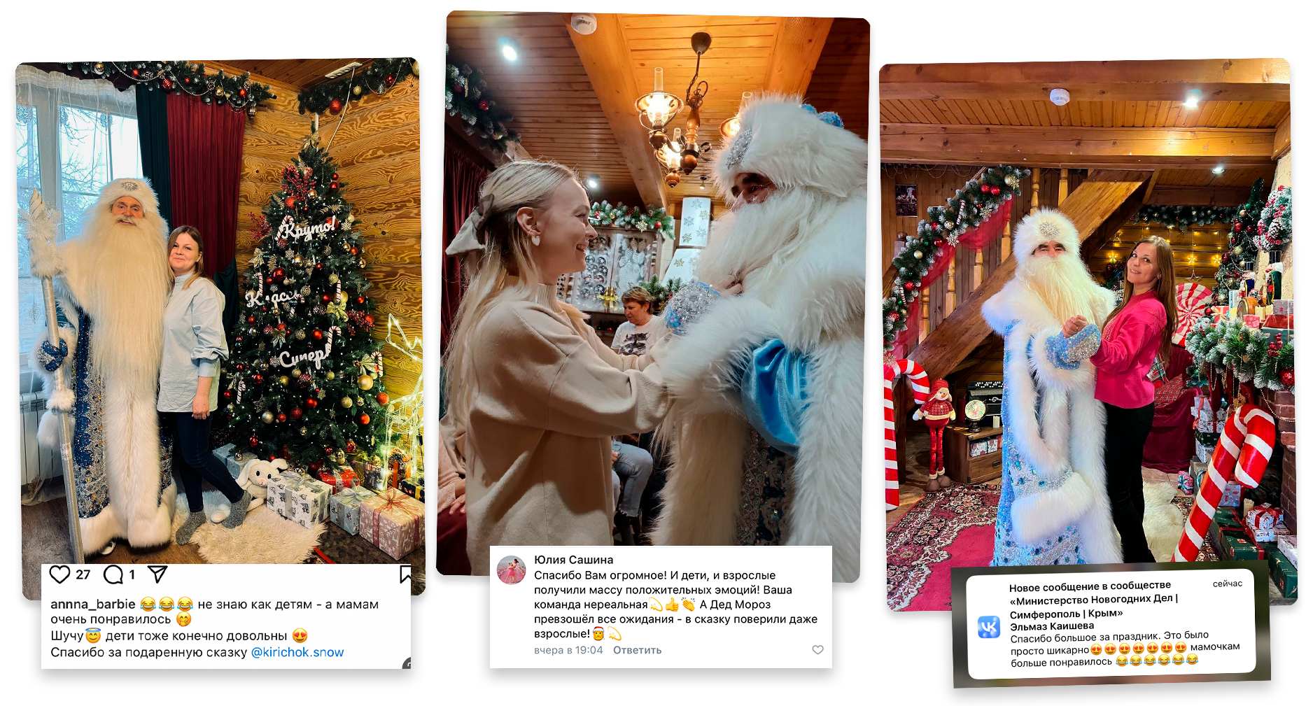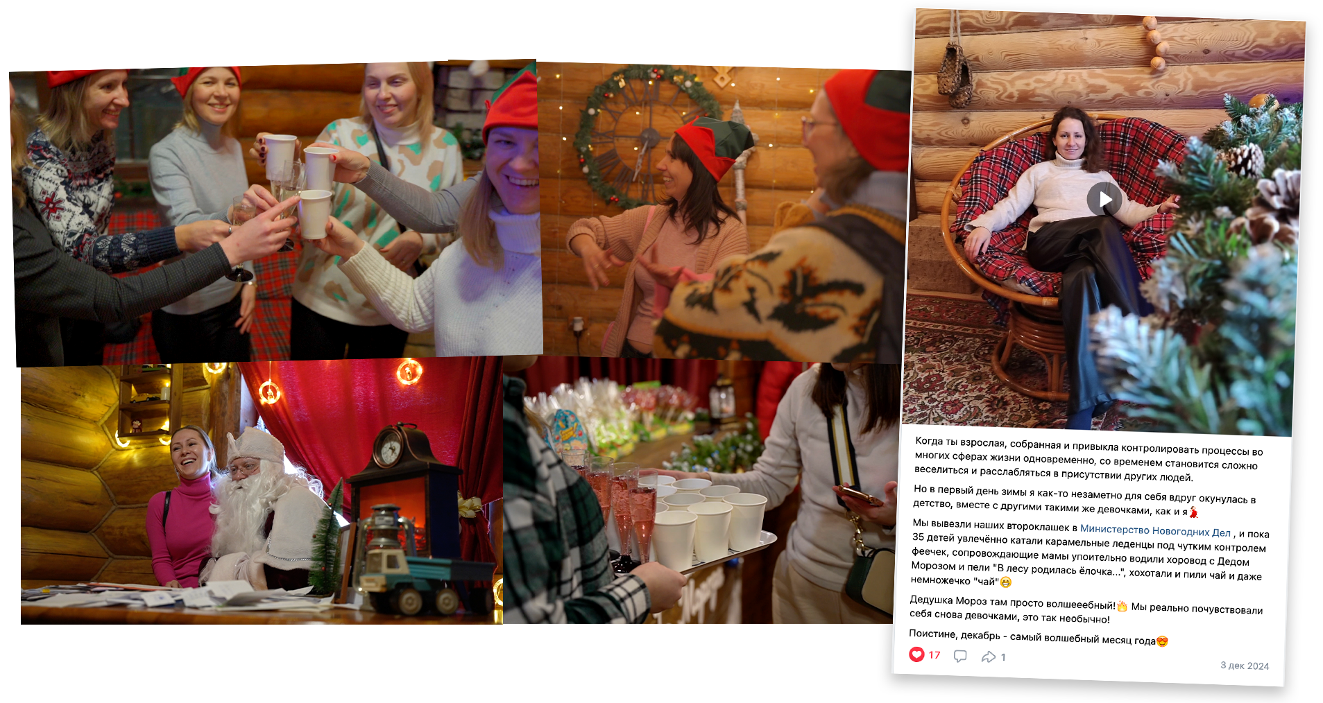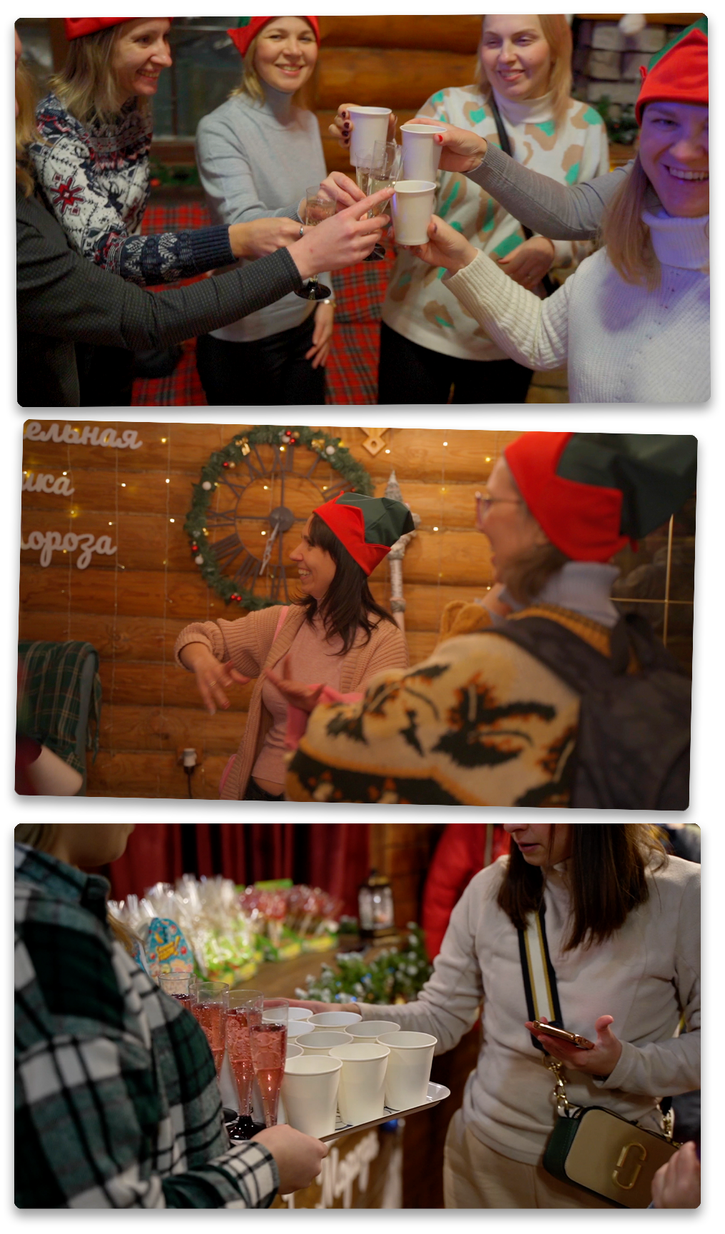 Праздничное игристое, вкусный чай, хороводы, стишки на стульчике, игры, обнимашки и фото с Дедом Морозом - обязательно для каждой группы!