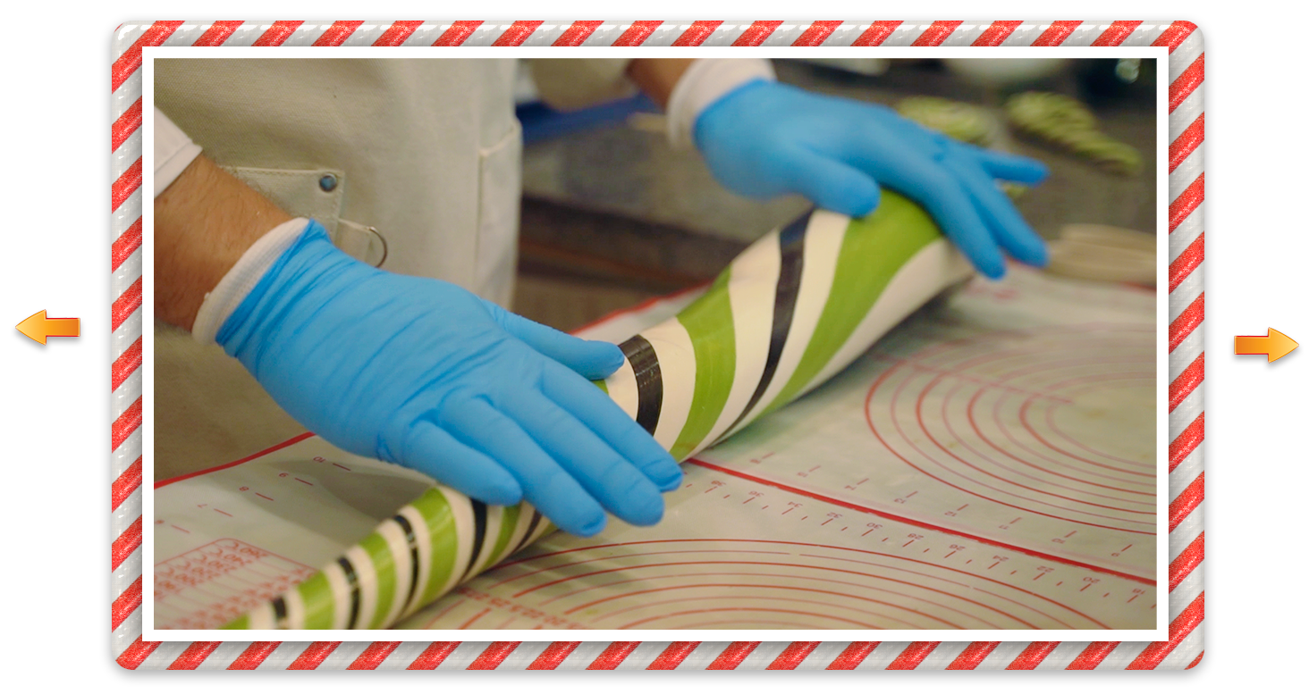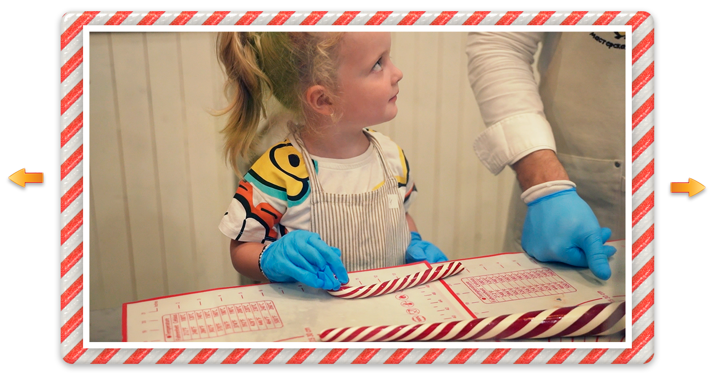 Больше зрелища с огромными леденцами от ведущего. Мы не просто заливаем формочки, мастера карамели крутят огромную колбасу