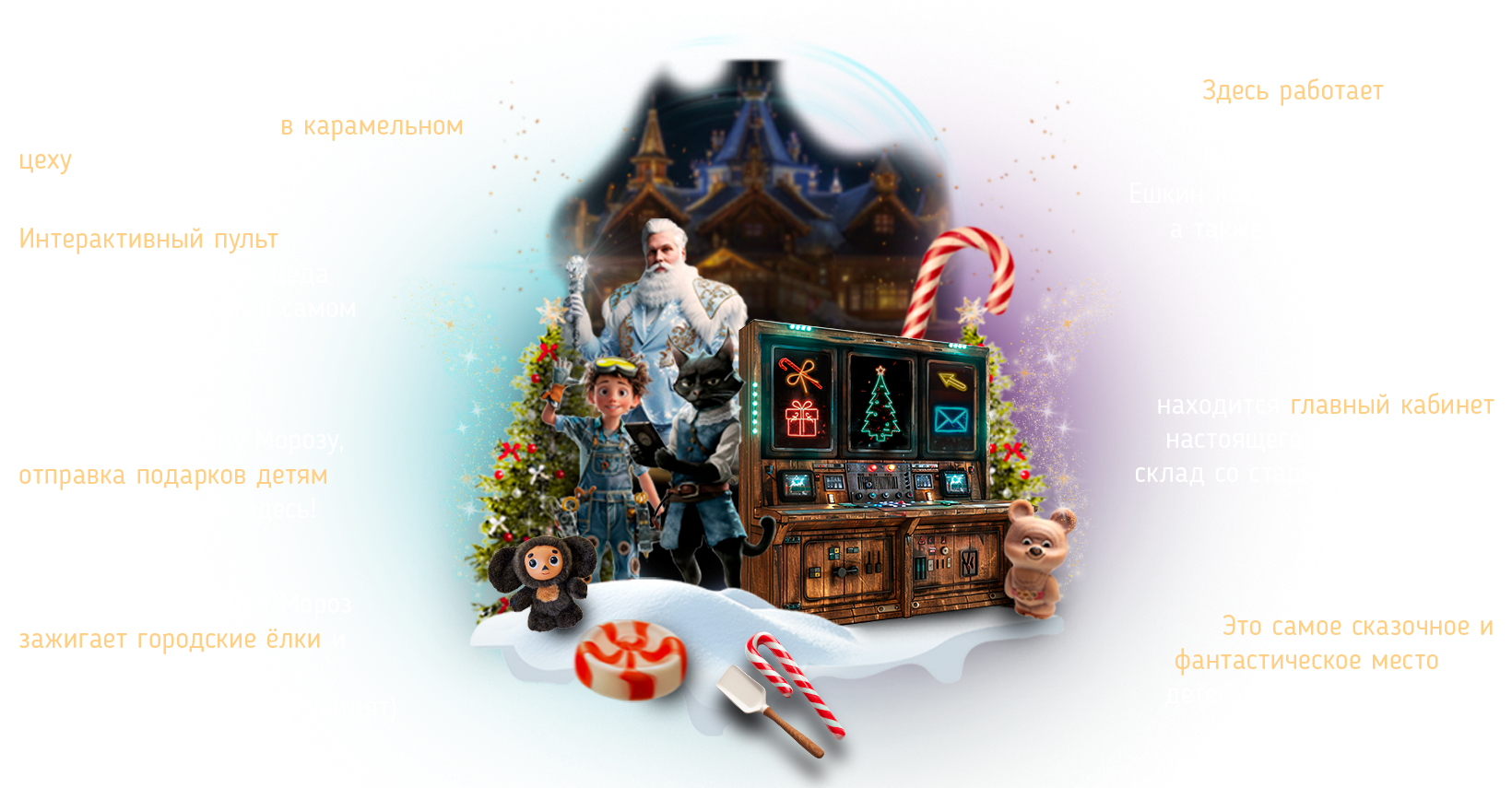 Антуражный и супердетализированный кабинет Деда Мороза. Здесь дети пообщаются с Дедом и поучаствуют в интерактиве с его смарт-пультом управления новогодними делами