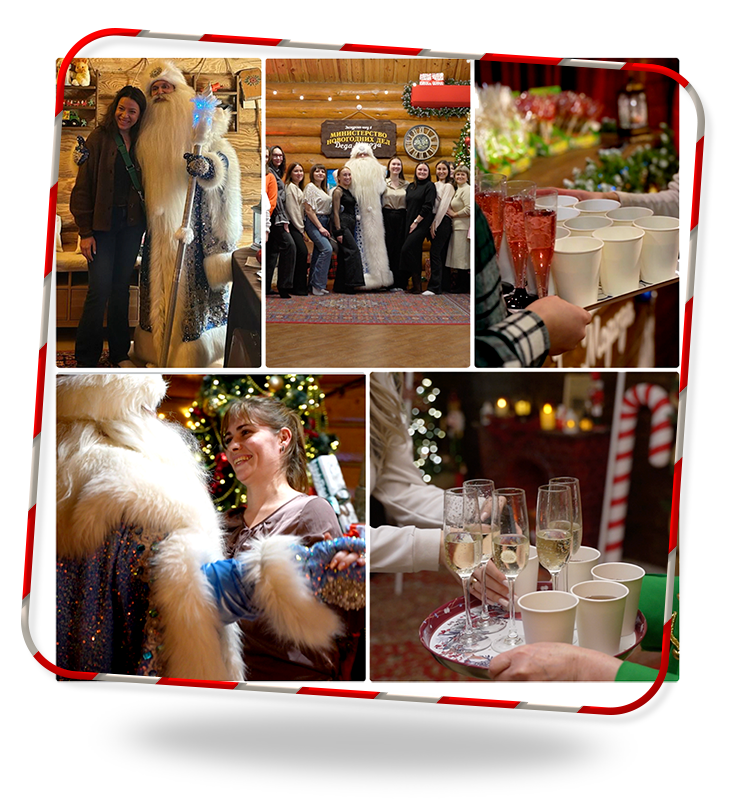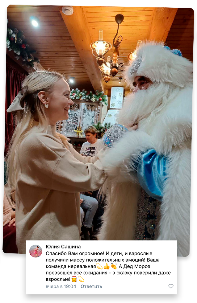 Праздничное игристое, вкусный чай, хороводы, стишки на стульчике, игры, обнимашки и фото с Дедом Морозом - обязательно для каждой группы!