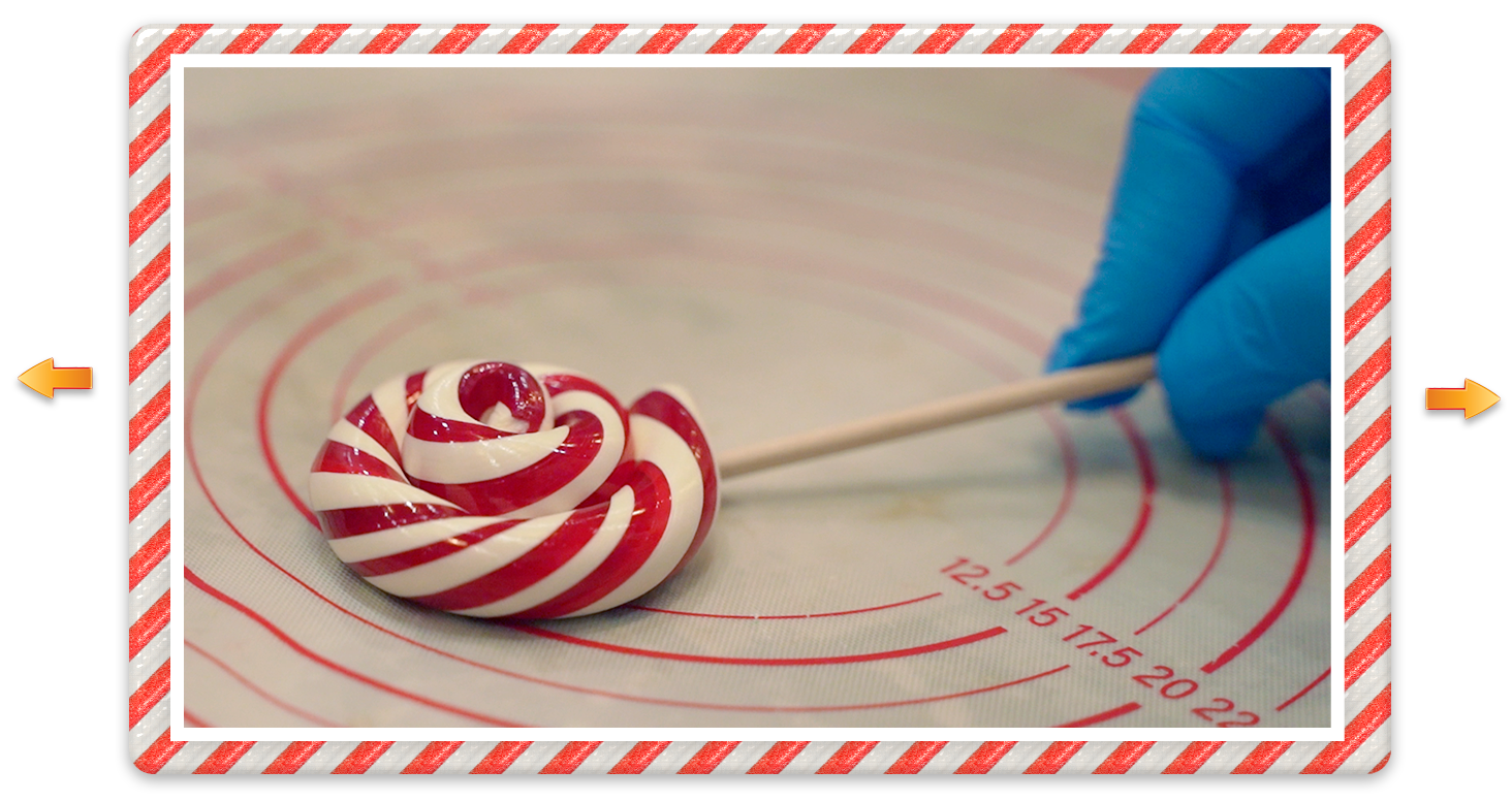 Больше зрелища с огромными леденцами от ведущего. Мы не просто заливаем формочки, мастера карамели крутят огромную колбасу